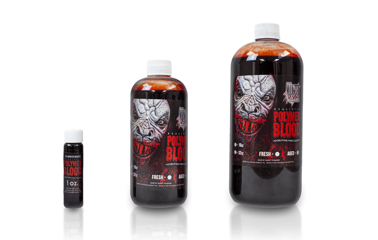 Their Polymer Blood—available in Fresh and Aged variants—is designed to complement latex masks and props. It provides a permanent, high-gloss, flexible finished bloody mess that dries tack-free and becomes waterproof and scuff-resistant for a long-lasting realistic appearance.